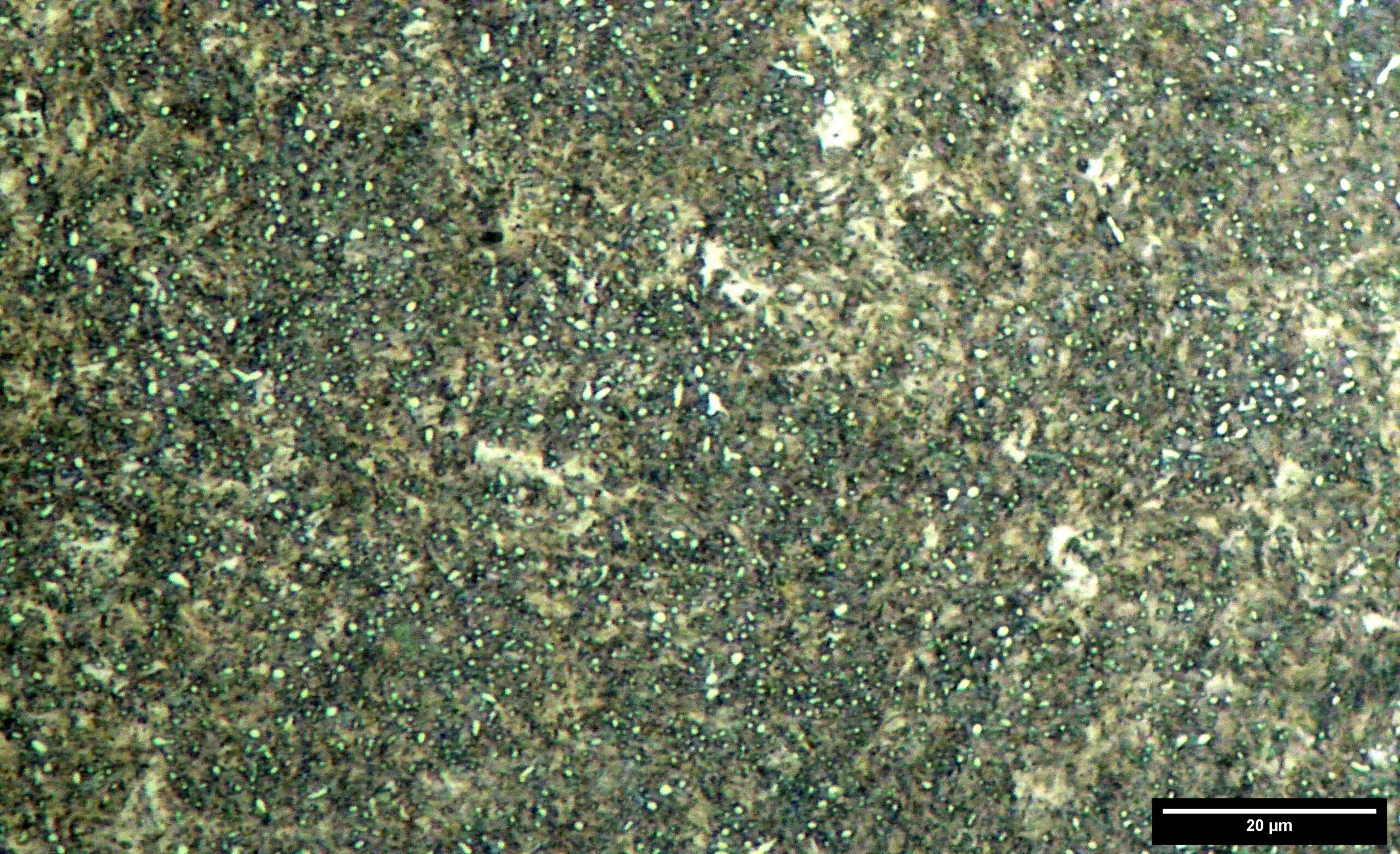 Looking at a lower magnification micrograph, the carbide structure appears relatively consistent throughout. There are no visible layers from the forge-folding process. There is a “bright spot” in the upper left portion of the image. Higher magnification reveals that this is not carbide clusters but either an etching artifact or retained austenite.