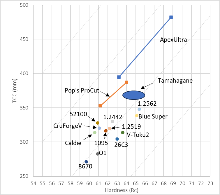 There aren’t many low-alloy steels I have tested that would be in that hardness range. The light grey dotted lines show the approximate relationship between hardness and edge retention. So you will notice that the tamahagane is on the same line as most of the other low alloy steels, especially after accounting for the knife being thinner behind the edge. This is not too surprising given that most of the low alloy and carbon steels have tested in a similar range after accounting for hardness.