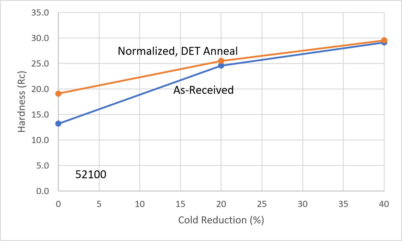 Using a carbide hammer on a piece of steel is a type of “peening.” Peening is a general term for working the surface of a material, usually by cold work. I have an older article about cold work such as cold rolling and cold forging. And a somewhat newer article where we tested the properties of 52100 after cold working. Cold work strengthens/hardens a metal or material. If you cold work an entire piece such as through cold rolling you get an increase in hardness depending on the percentage of cold work, such as we measured with 52100: