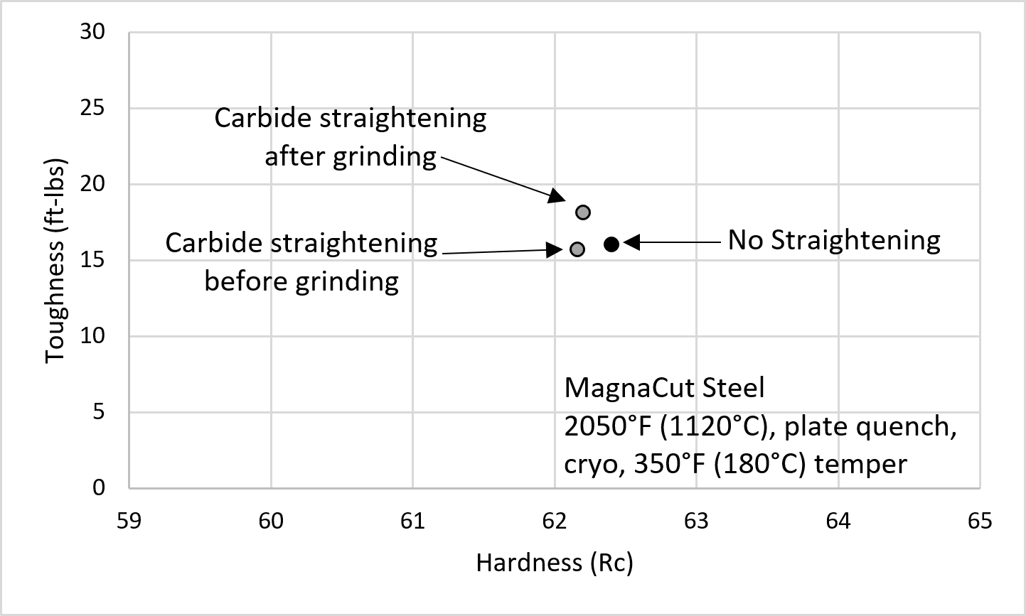 I have gotten many questions from knifemakers the past few years asking if straightening by peening is leading to microcracks that are embrittling the steel. As described above, peening, does not mean cracks are forming. It is a cold work process, and as long as the steel is not overly cold-worked there are no negative effects on properties. To test this, I used a carbide ball straightening hammer on some toughness coupons of heat treated MagnaCut. For one condition, I hit the pieces in many places before grinding and finishing both sides (the peened surface was removed). On the other coupon I ground and finished the coupons first and then I hit it many times with the straightening hammer after. With these three different conditions (with three samples of each condition) I measured the impact toughness. This test measures the energy required for breaking the steel. So if there were any pre-existing cracks we would expect to see a reduction in the measured impact toughness. The results in comparison with samples that saw no carbide hammer blows are shown below: