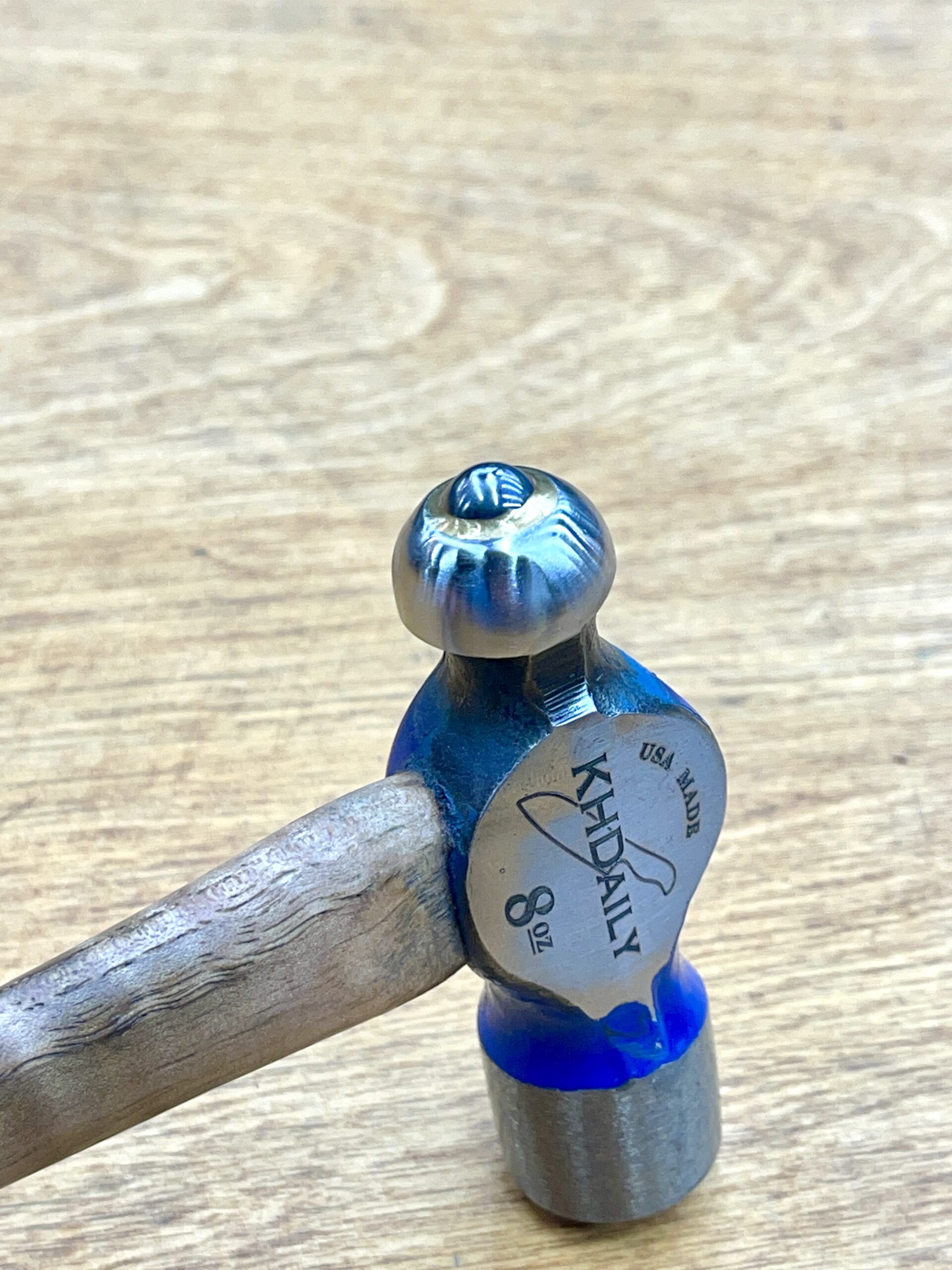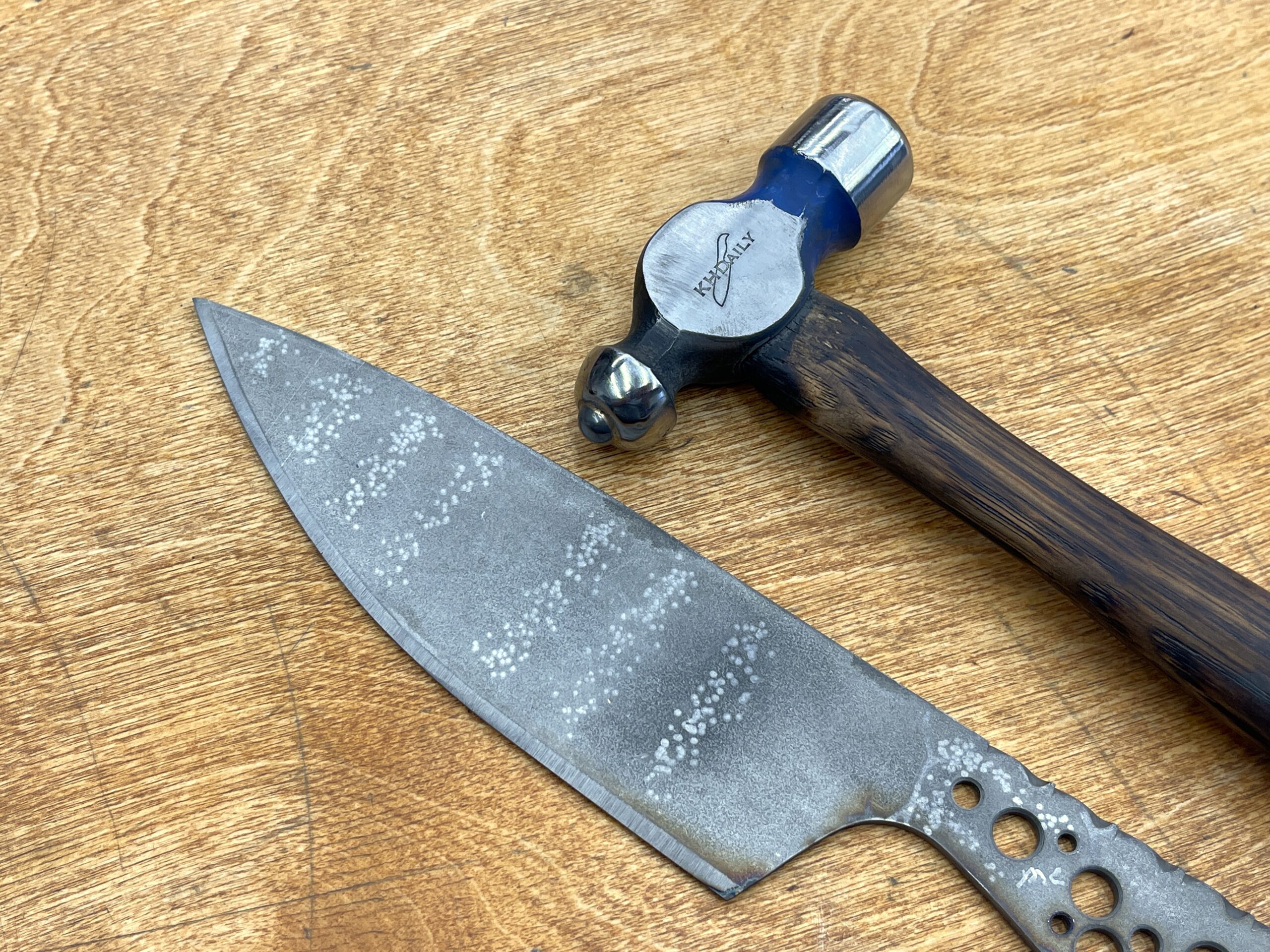 The peening is performed on the opposite side from typical forging. The peening “stretches” the worked surface which returns the piece flat. This can be done with most peening methods including shot peening. However, hammer peening has become common for knifemakers over the past decade or two. This can be performed with a carbide ball or with a chisel.