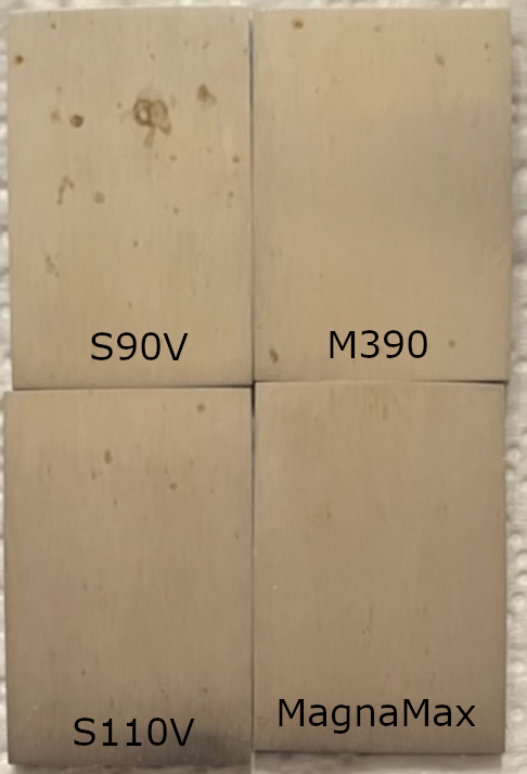 M390 and S110V actually have pretty good corrosion resistance, I had previously given both a “9” in my knife steel ratings. So it isn’t surprising that both of those grades had only a few small rust spots in this test. S90V has worse corrosion resistance and had significant rusting. MagnaMax, however, showed no rust spots in this test.