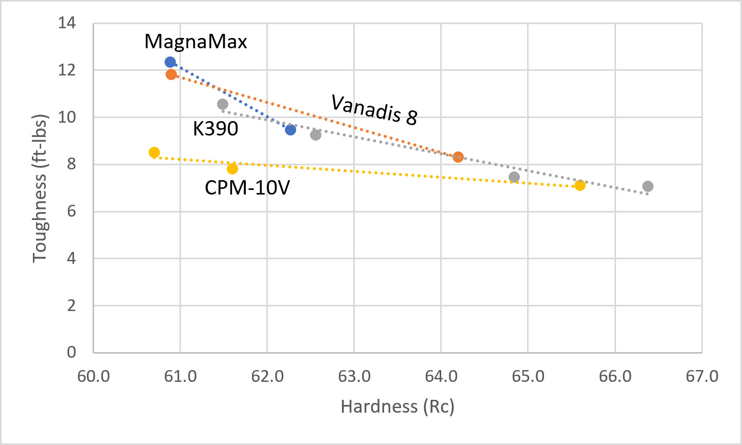 Comparing against its benchmark grades, MagnaMax is the same as Vanadis 8 and K390, a small step above CPM-10V. So even though it is a stainless it still matched the toughness of the non-stainless powder metallurgy steels. So those that have been happy with the toughness of their K390 knives will also be happy with MagnaMax.