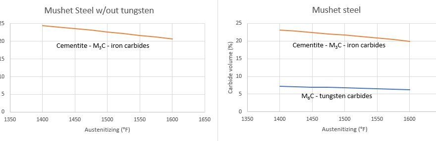 The steel largely recognized as being the “first tool steel” was developed by Robert Forester Mushet, a British metallurgist, in 1868 [1]. Mushet improved the Bessemer steelmaking process through the addition of a small amount of manganese [1]. Later Mushet was experimenting with various additions of elements and discovered that one of his bars of steel had become fully hard despite not being quenched. This was called a “self-hardening” and later “air-hardening” steel because it could be fully hardened in air rather than requiring a water or even oil quench. The reason for the ability to self-harden is due to the property of hardenability, which I have covered in a Bladeforums post [2]. Hardenability is essentially the property of how slowly a steel can be cooled from the hardening temperature while still achieving a hard martensitic microstructure rather than a soft ferrite-cementite microstructure. This steel was high in tungsten and manganese, and it is sometimes erroneously reported that it was the tungsten that gave it the high hardenability; however, it was primarily the manganese that gave it the ability to harden in air, as tungsten adds little to hardenability [3].